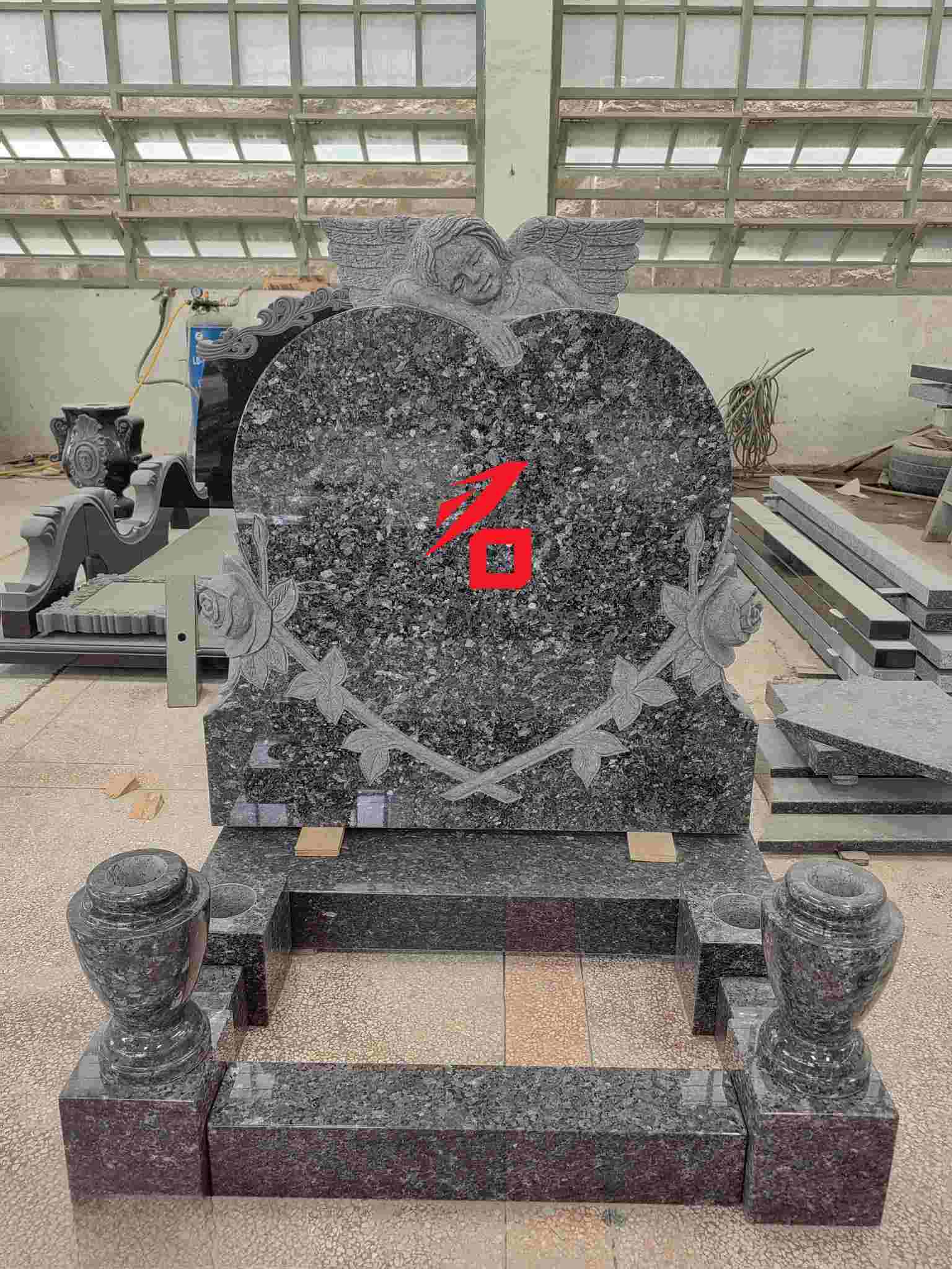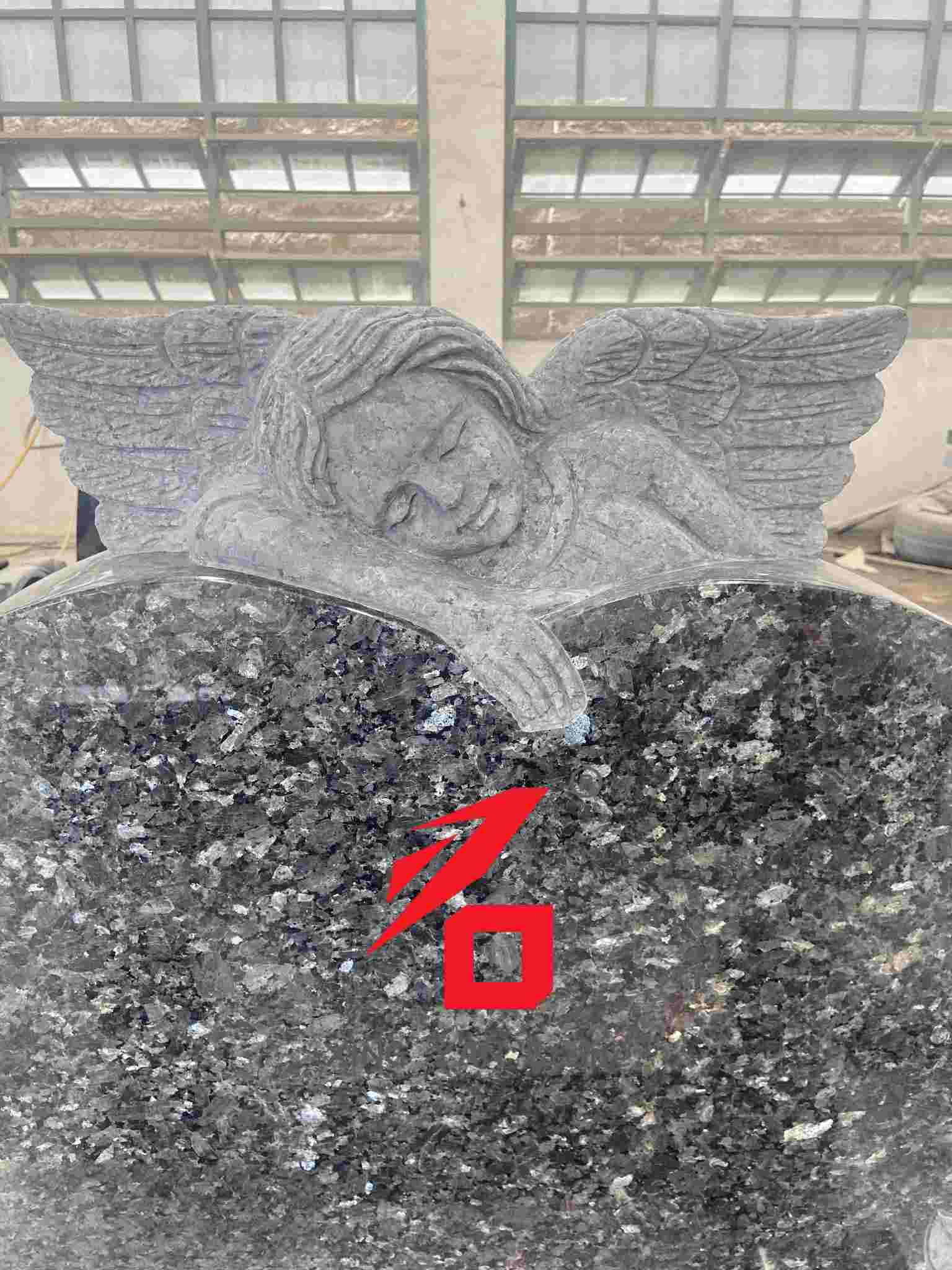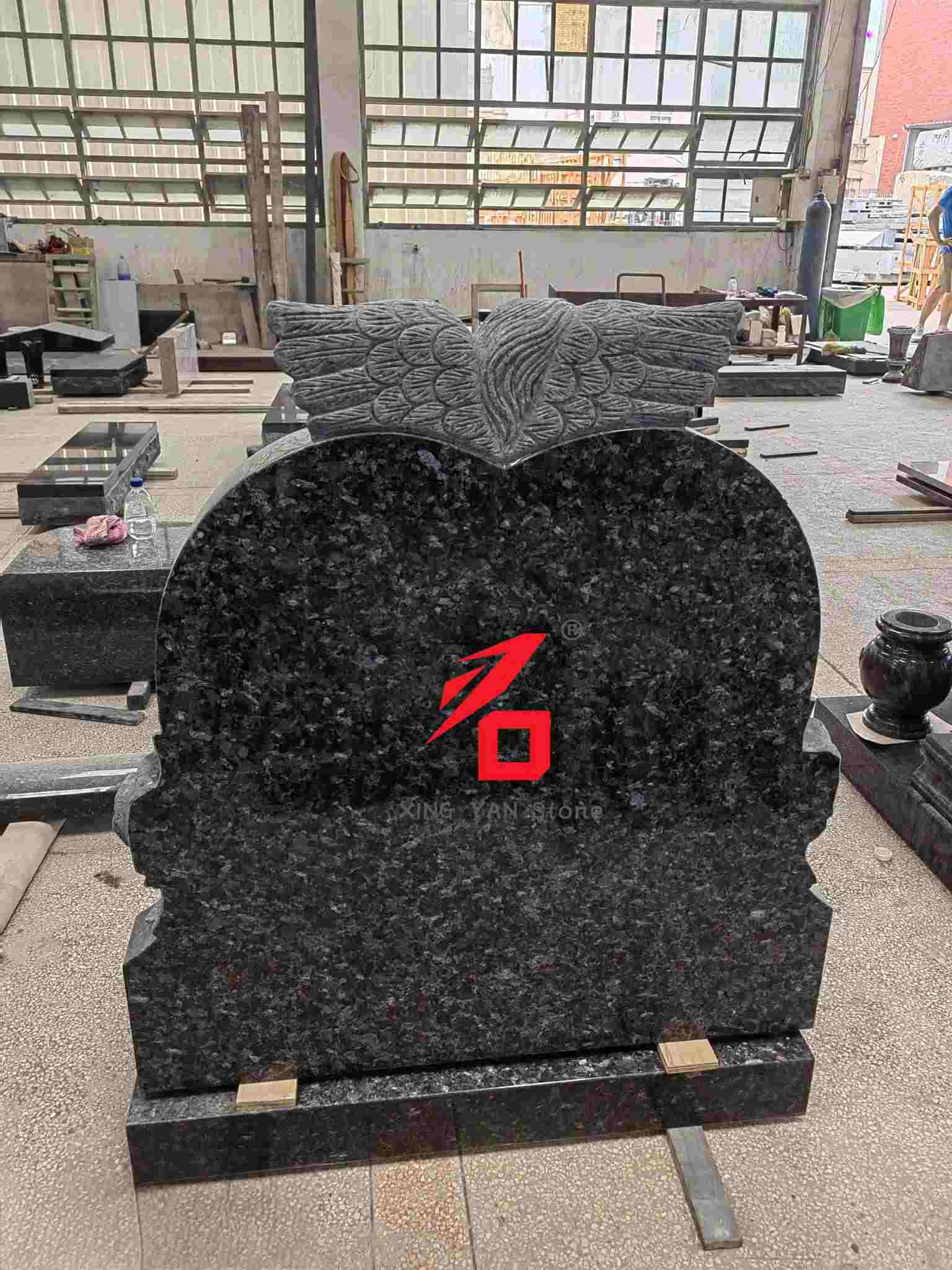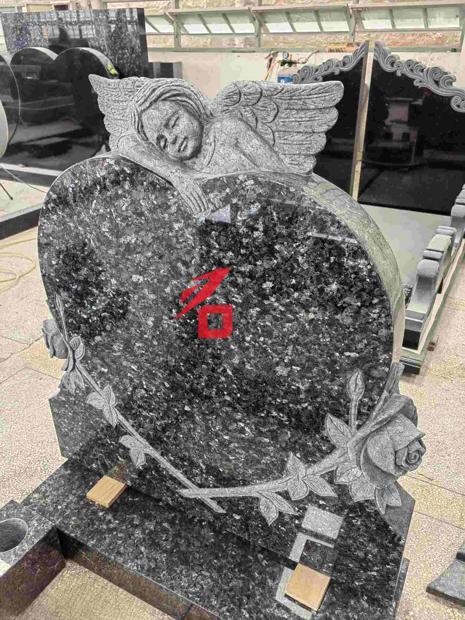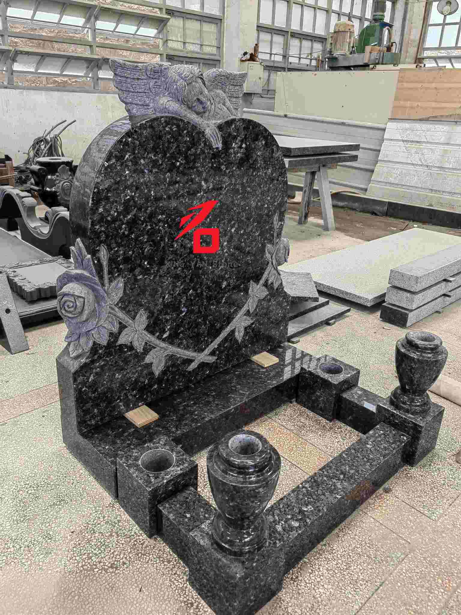 Materiał: Niebieski perłowy granit o dużej gęstości, twardy i odporny na warunki atmosferyczne, z ciemną podstawą, która emanuje uroczystym i dostojnym wyglądem;