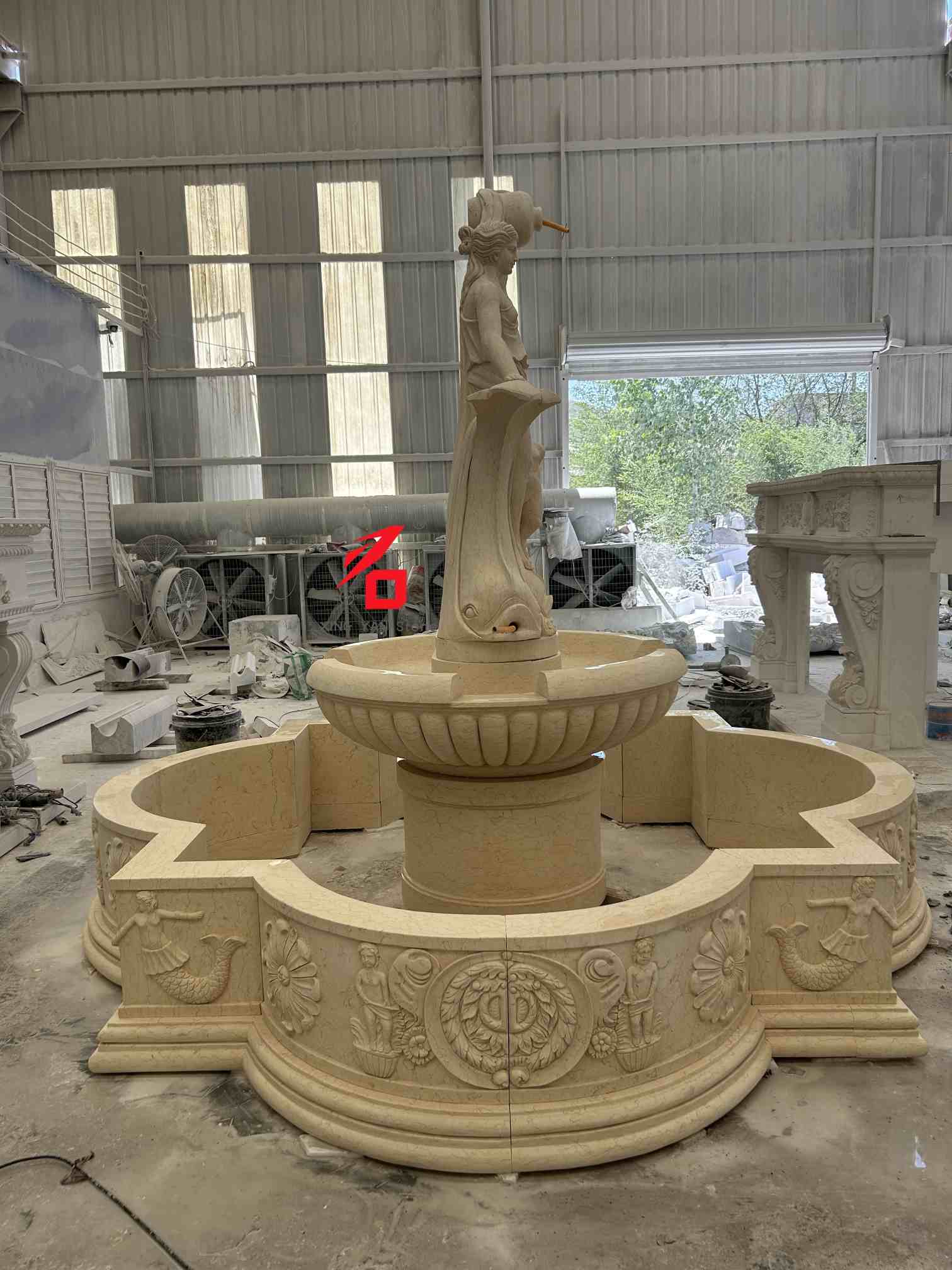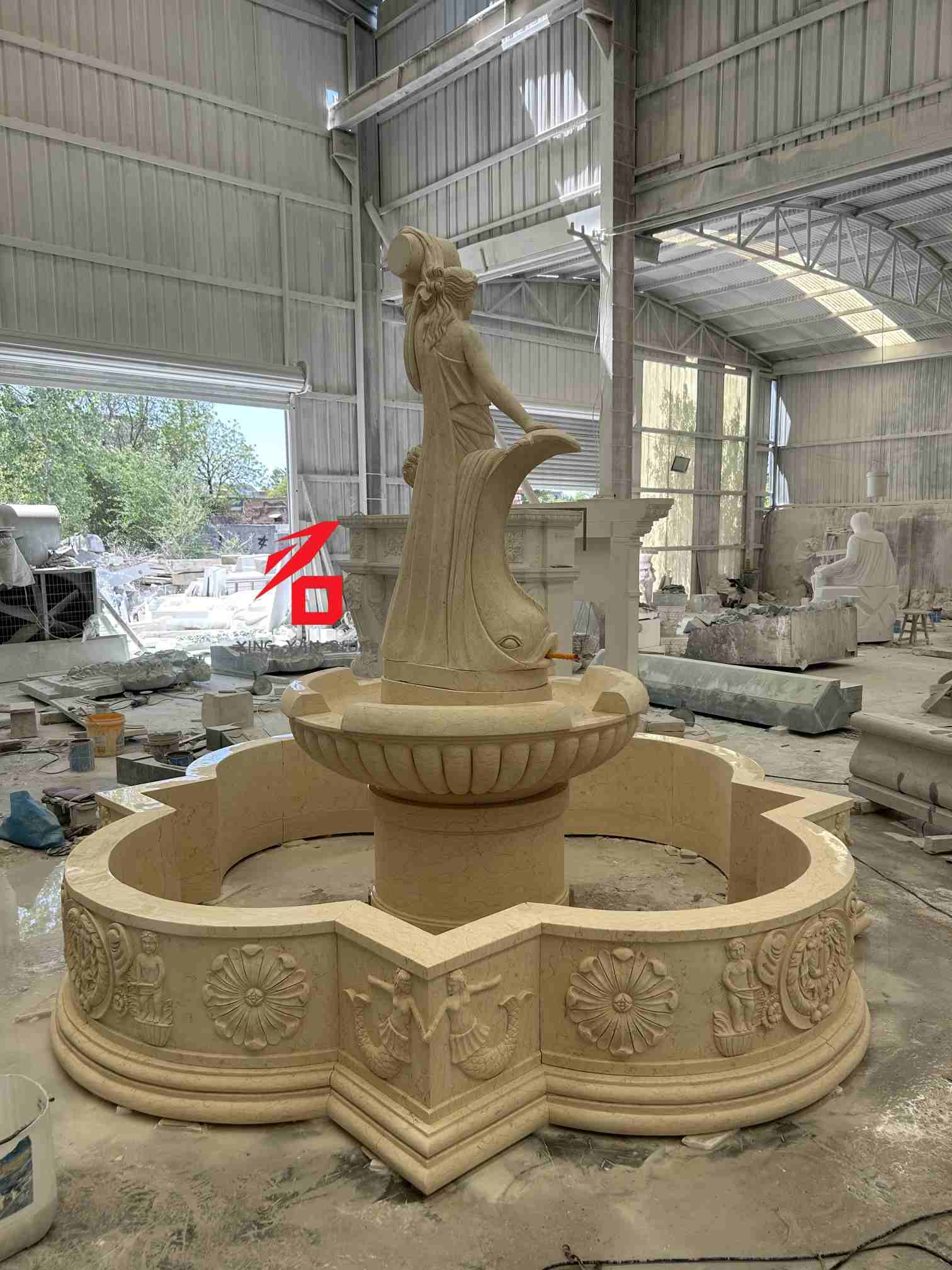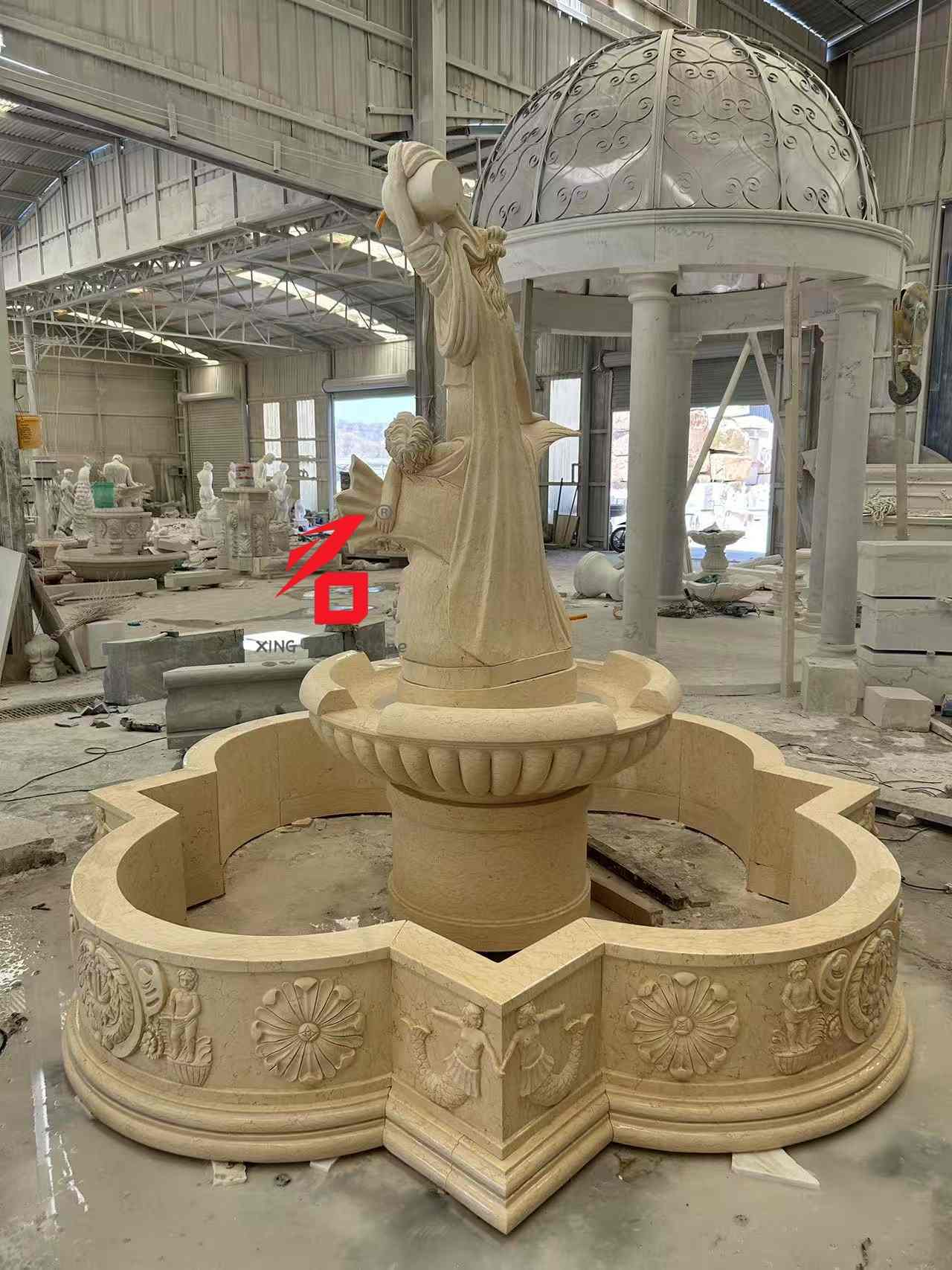 Opcje kamienia: Niestandardowe opcje kamienia obejmują beżowy marmur, biały marmur, piaskowiec i inne kamienie naturalne. Delikatna faktura kamienia, ciepły kolor i duża odporność na warunki atmosferyczne zapewniają trwałość fontanny i estetykę podczas długotrwałego użytkowania na zewnątrz. Rzemiosło rzeźbiarskie: Wykorzystując tradycyjne techniki ręcznego rzeźbienia, doświadczeni rzeźbiarze skrupulatnie wykonują każdy szczegół, od wyrazu twarzy bogini i draperii po ozdoby w kształcie dziecka i ryby, ukazując artystyczną fakturę i trójwymiarowość europejskiej rzeźby klasycznej.